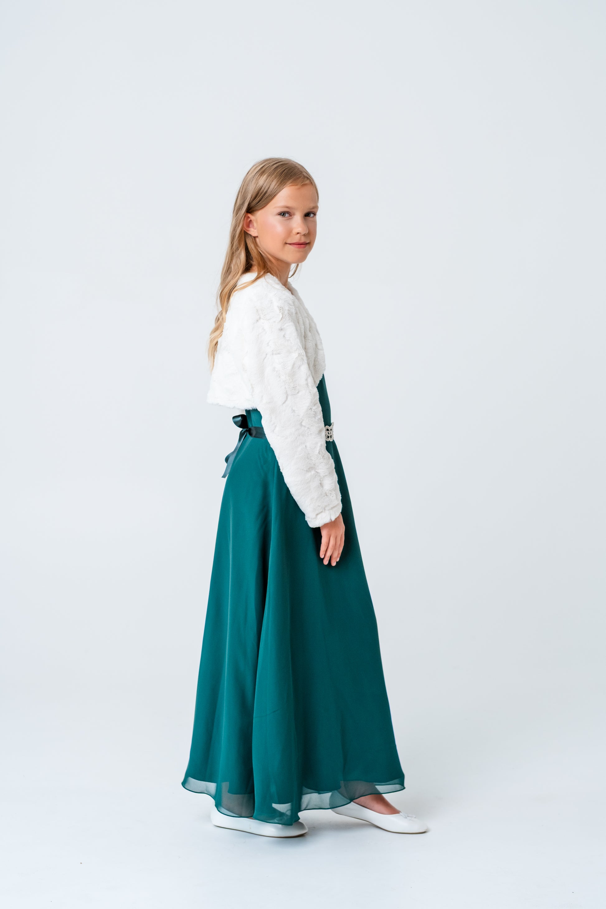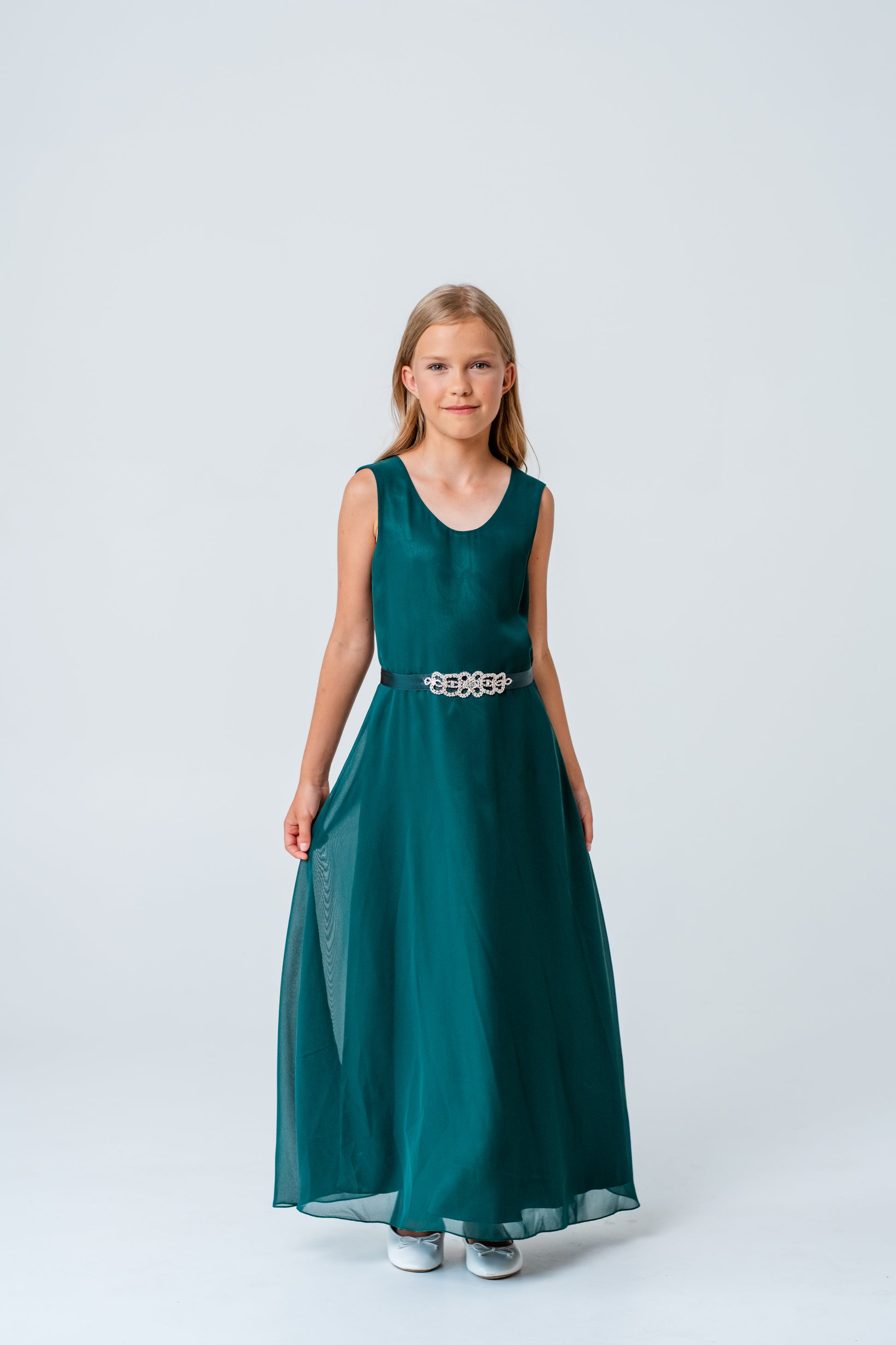Tyylikäs, tummanvihreästä sifongista valmistettu juhlamekko, jonka vyötäröä kaunistaa kristallikoriste. Mekossa on satiinivuori ja takaosassa pukemista helpottava vetoketju. Mekko on elegantti ja laskeutuu kauniisti, jonka ansiosta se sopii monenlaisille vartaloille.